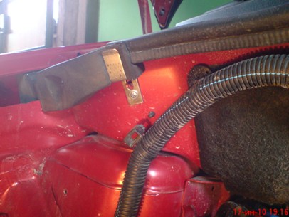 Прорезь на хомуте была. Она как раз кстати пригодилась т.к. справой стороны в месте крепления кронштейна есть шпинёк, прорезью туда. На фартуке авто тоже просверлил две дырдочки.