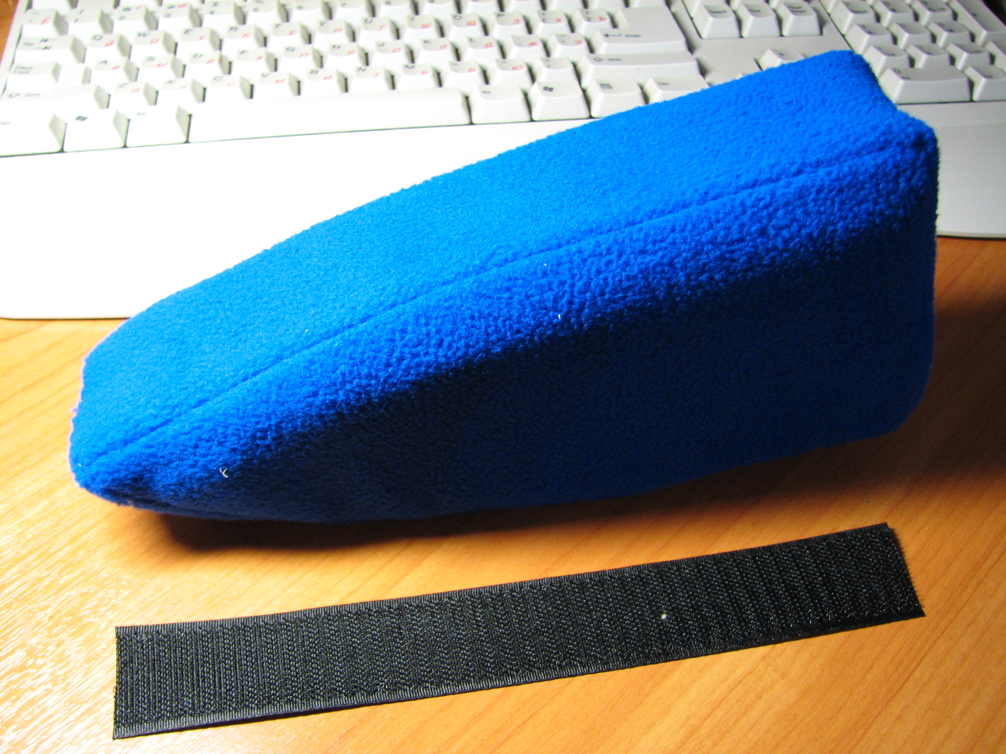 3.Берем простую мелкопористую мочалку из поролона..накладываем первоначальную выкройку и верезаем треугольник.Потом мерием его по периметру и толщину и вырезаем полоску....