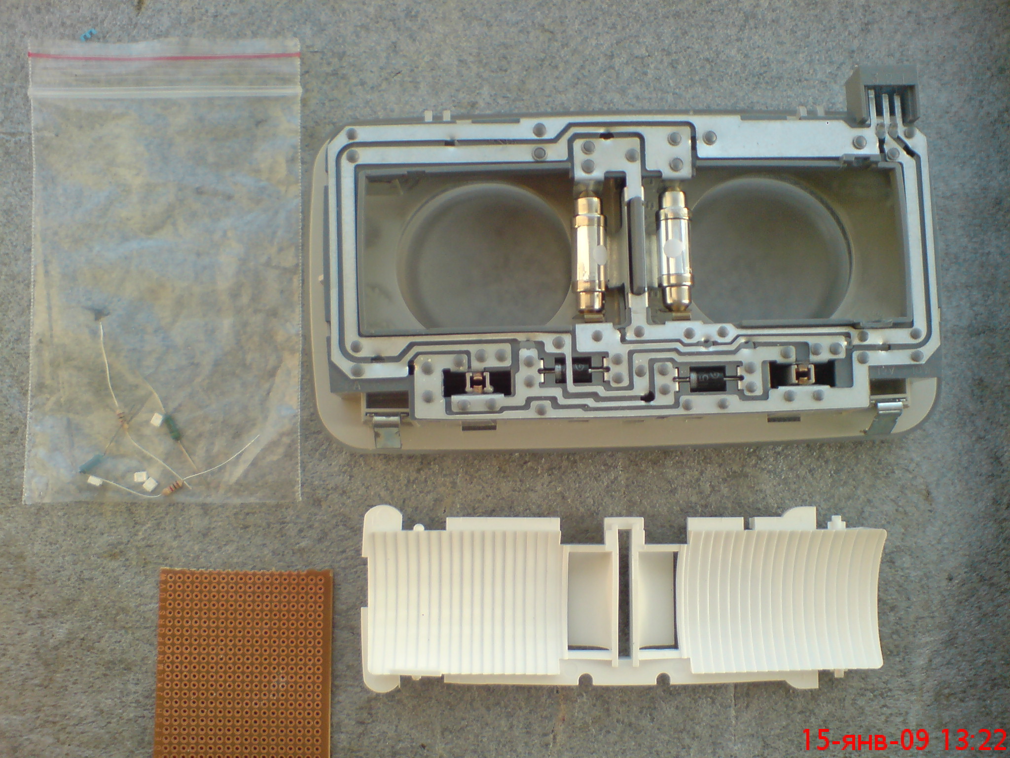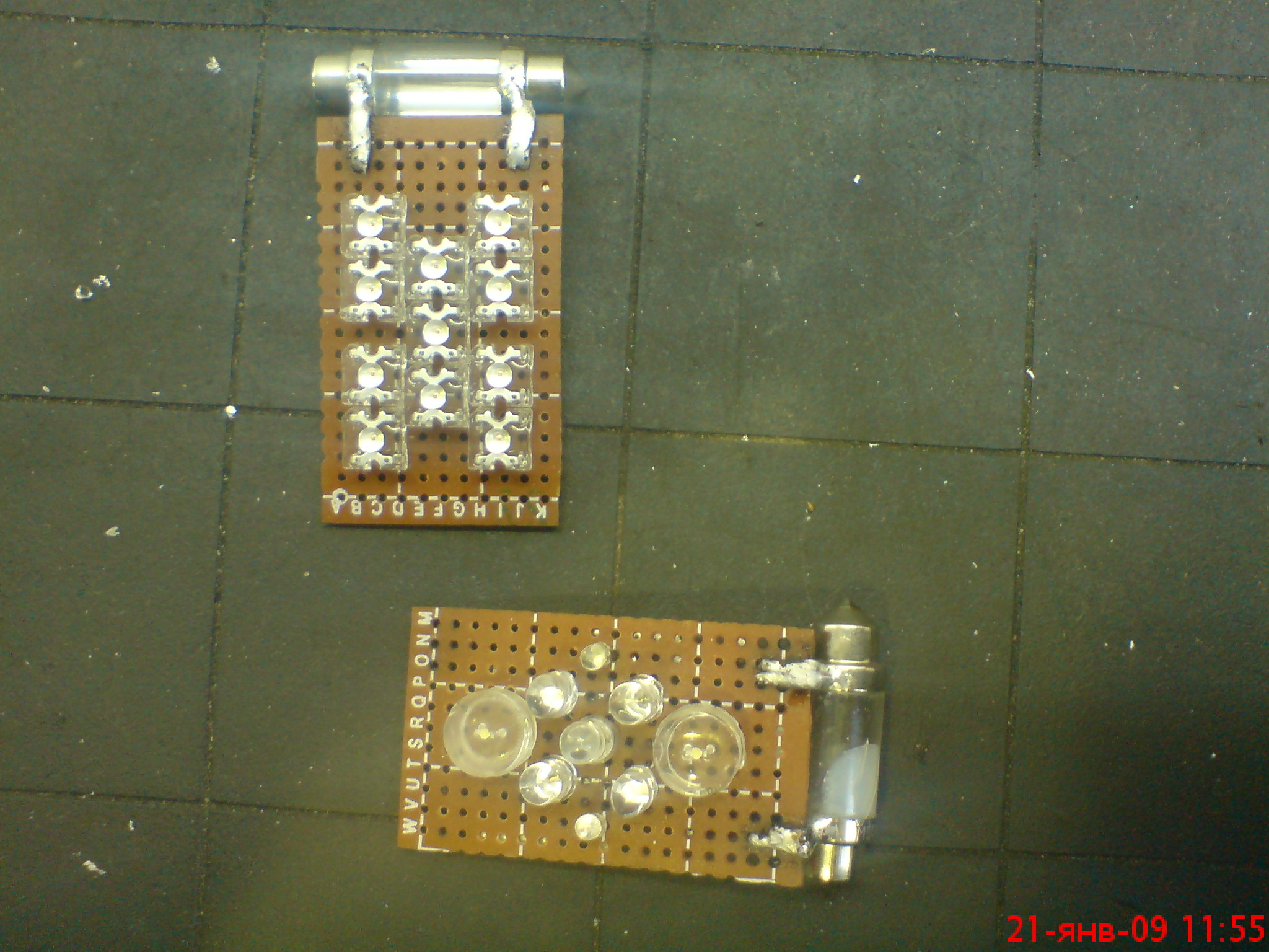 для начала надо раздобыть монтажную плату (2 шт), 2 св\диодные лампы, св\диоды, паяльные принадлежности.