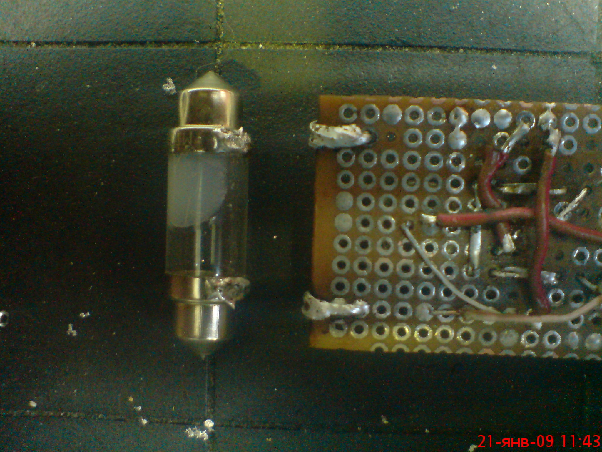 3. разбираем св\лампу и убираем все что там внутри. разбирается довольно легко, боковые металлические контакты слабо приклеены к пластиковой середине. капаем паяльной пслотой на контакты лампы и припаиваем ее к краю монтажной платы.