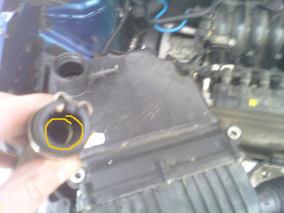 2.Теперь нащупываем шланчег,также ту дырдочку и натягиваем его...натягиваем.Только острожно..вокруг пластик,разъемы и т.д. Остается одеть патрубок на клапанную крышку,одеваем,да вот беда долбанутый хомут....Одеть его сложно по месту,ибо там датчик рядом,а тонких плоскогубц небуло....Убрал я иво нафех..и одел простой резьбовой.Конечно...одеть можно,но я поберег нервы и время..та и не май месяц вовсе.