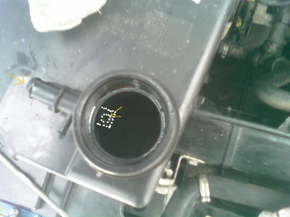 1.Переворачиваем эту всю приблуду,видим резиновый патрубок на ней,опять отстегиваем "долбанутый" хомут.На рисунке показаны стрелочками дырочки....Выход с клапанной крышки (первый куплет пункт 2)