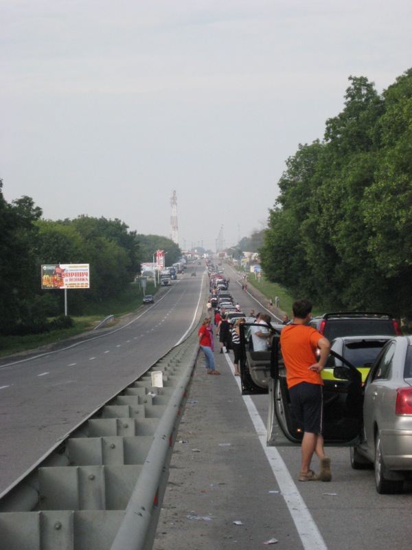 Дорога отличная, пустынная, на столько что начиная засыпать((( пит стоп на заправке, гривен нет, но с радостью принимают рубли)) пьем кофе и едем дальше... Знак конец автострады и сразу после знака ямы бугры и вообще черте что... еле успеваю оттормазится, едем за кемто со скоростью 40км/ч... до пункта назначения 600км(