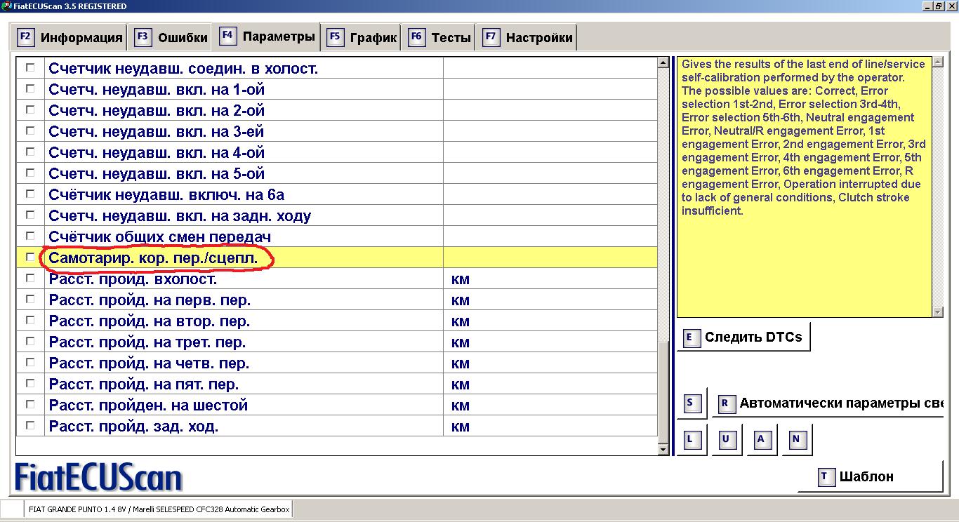 Затем запустил "Сервисная калибровка"(свойство в Параметрах "Самотарир.кор.пер./сцепл." включил), после того как процедура завершилась, сообщив, что не смог переключить на несуществующую 6-ую передачу, свойство "Самотарир.кор.пер./сцепл." на вкладке Параметры сменило свое состояние на "Correct".