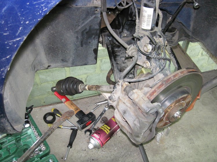 Сегодня поменял сальник коробки (левый). Пока ждал фотографии, "разработал" свою методику. Загнал машину на яму, задомкратил левое переднее колесо, снял колесо. Все как на ладони. Для того, что бы заменить данный сальник - вытащить из коробки левый привод, потребовалось всего лиш открутить нижнюю шаровую. Этого вполне достаточно. Появившийся свободный ход привода позволяет его вытащить из коробки.