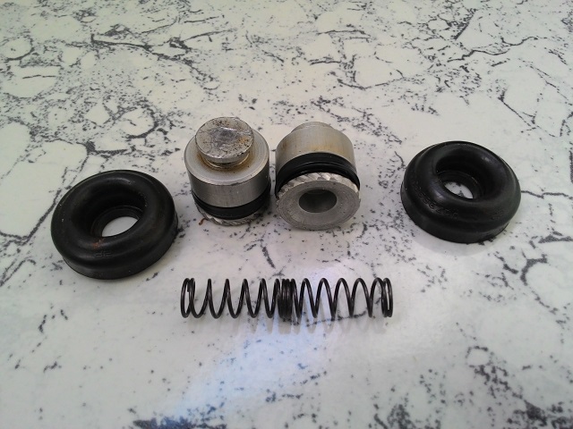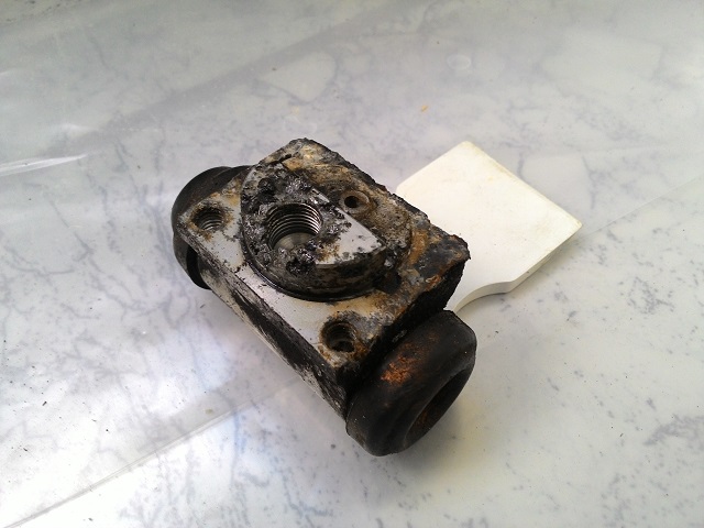 Продул через систему почти литр т/ж включая цилиндр сцепы. На передних колесах в следующий раз без обжимного ключа не обойтись.Заменил задний правый цилиндр,он оказался полностью алюминиевый, в т.ч. и поршня.Вот,что стало с ним за 139456км