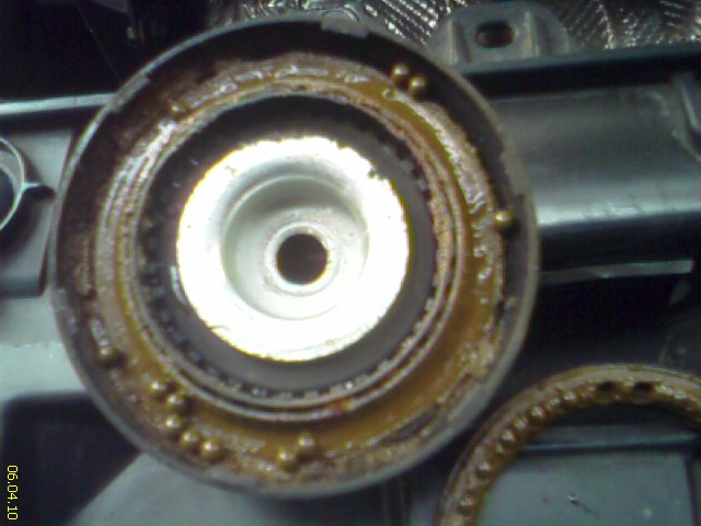 Некоторые шарики выпали из кольца.Повсюду смесь воды,ржавчины и остатков смазки