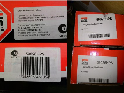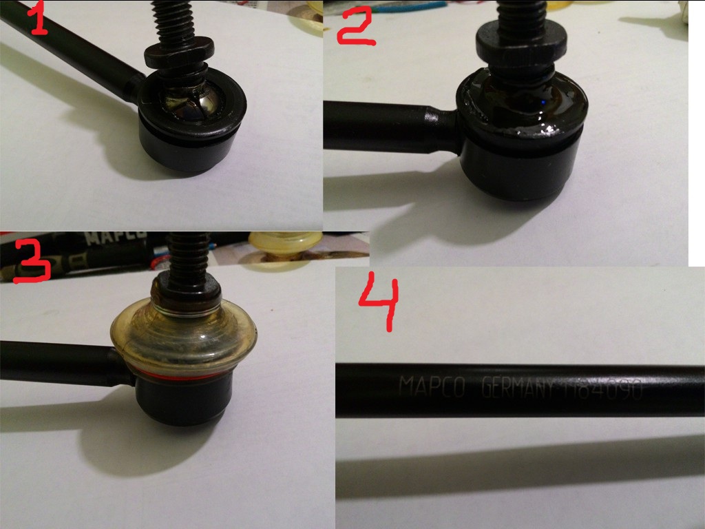 С завода стояли по моему TRW,которые померли весной 11го года на 59-й тыщи после почти трех лет езды по СПб,в т.ч. последних 7-ми месяцев прибывания в Московском регионе :D Послушавшись любителя морепродуктов, купил TeknorotF-480 (29.03.11 720 руб за 2 шт.),померли практически ровно через год,проехали 19685 км,затем по традиции потянуло на Европу,выбор пал на SWAG 70 92 7414 (купил 20.04.12 1016 руб за 2шт) заменил их на пробеге 78565 км,предварительно накачав в них смазки.Сегодня 24.01.15 год,пробег 119300 (получается проехали 40735 км или почти три года областных дорог),стучат,особенно слева,при чем в морозы потише,наверно железо при холоде сжимает шарнир. По опыту другой машины решил остановиться на Mapco, артикул 59026HPS. По традиции поставщики не очень то увлекаются смазкой (фото1),смазал "литием" (фото2),чисто "силиконовый" тугой пыльник (фото3),который при постановке будет обработан силиконом дабы не высыхал и не трескался,ну и надпись на штанге(фото4) внушает доверия. Вообще запчасти по ходовке этой конторы практиковал на двух немецких машинах,вроде хорошо ходили и даже еще ходят :D