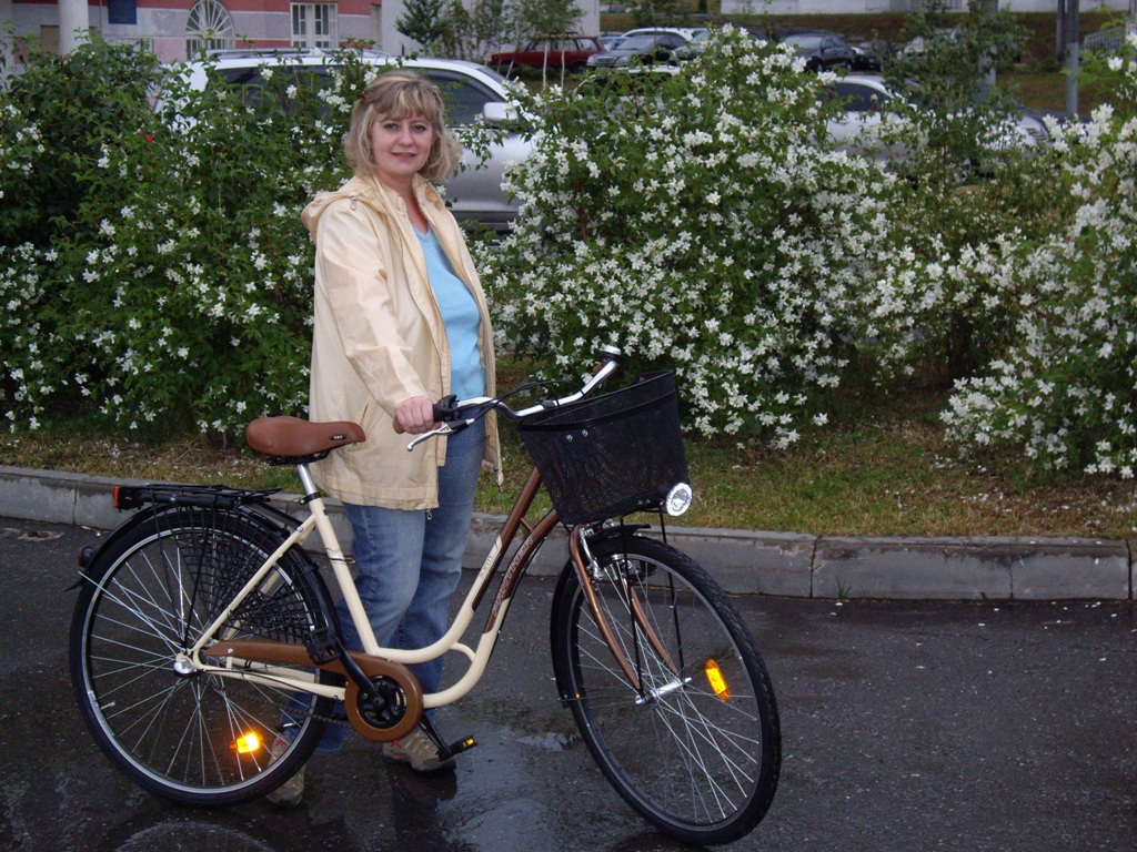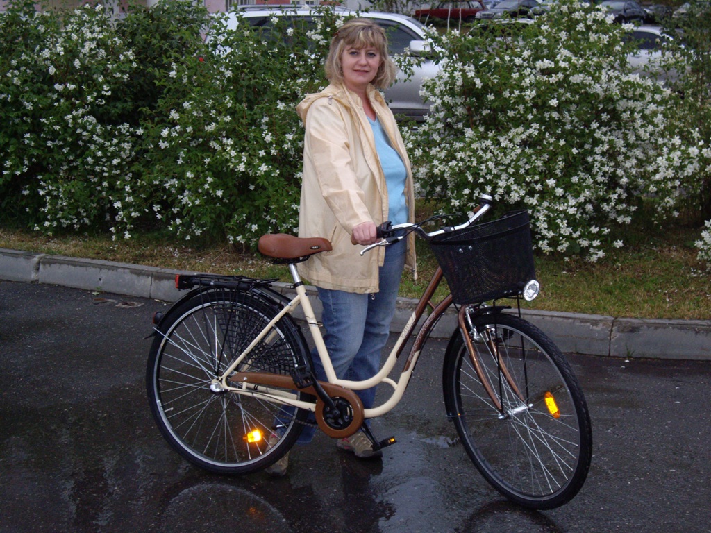 , даже есть брызговик маленький, фонарик, защита цепи и спицы закрыты, чтобы подол юбки не попадал - все уже на нем было, докупать ничего не надо! очень удобное седло - мягкое, женское... суперский!...