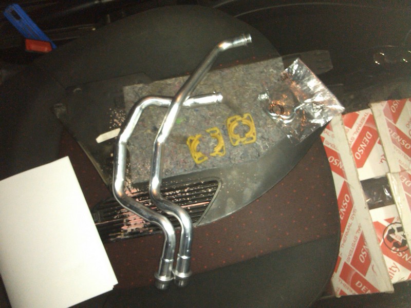 Как видно на картинке выше, использованы родные фиксаторы- техник был весьма аккуратен при демонтаже радиатора. Прокладки, естественно, заменены на свежие. Таким образом, из комплекта "трубы, металлические фиксаторы, прокладки" использованы только прокладки. Немного обидно. После установки радиатора замена охлаждающей жидкости на Кастрюль, так как по спецификациям в инструкции к Фияту только он и проходил.