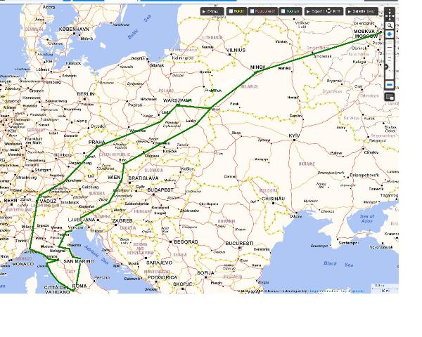 Белорусская трасса (4раза по 23рубля + 160р. за транзин) скучна и ограничение 120км\ч. Таможня белоруссии быстра и без досмотров. На польской границе стояли 3 часа. Пан на таможне бросил взгляд вглубь открытого багажника. спросил про "водка-сигареты имеются?" и тут же потерял к нам интерес. Ну не курим мы! А водку забыли купить в подарок! Польские дороги узкие, часторемонтируемые, больше 50ка\ч не проедешь. Ночевка в Отеле "Горски" под Варшавой. В Праге долго мыкались с парковкой. Нашли в каком-то переулке рядом с Карловым мостом местечко. Чешские дороги лучше, а фюрерская трасса Берлин-Мюнхен поразительна, но также местами ремонтируется. 3 ночи в Мюнхене у друзей. Интересный город, хочется туда вернуться. Были в замках баварских королей, сказочно. Далее через Боденское озеро, Швейцарию в Милан. 2 ночи в кемпинге на окраине Милана. Залезали на крышу миланского дуомо. Далее Генуя, Раппало. Итальянские трассы есть платные и муниципальные. Часто пользовались муниципальными дорогами. 2 ночи в кемпинге на Лигурийском побережье. Далее Лукка, Флоренция, Пиза. 2 ночи в кемпинге на Тирренском побережье. Потом Рим. 2ночи в кемпинге на берегу реки Тибр. Далее переправа через горы Апеннины в город Пезаро. 2 ночи в кемпинге на побережье Адриатического моря. Далее Болонья, Падуя, Венеция. 2 ночи в кемпинге на Лидо деЭзоло. С Венеции в Вену. Ночевка в мотеле в пригороде Вены. Далее через Брно в Люблин. В самом Люблине отели оказались дороже ожидаемого, поэтому выехали за пределы города и остановились в мотеле около трассы. на следующий день Терасполь-Брест-Москва.