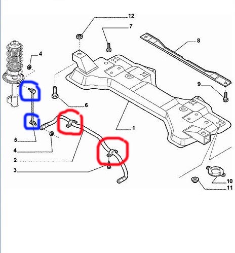 Обычно начинает стучать при проезде стыков,каких-то мелких ямок с отвесными краями....начинает как костяшкой бить.... :D Потому как стойка (синие кружки) работает одновременно со стойкой аммортизатора. Вобще сильный удар мог повредить палец в посадочном месте... Также подергай торсион..посомтри не стучит ли в местах,обозначенные красными кружками....Там такие резинки есть,когда они изнашиваются тоже начинается неприятный стук. Я как-то случайно залез под спринтер и обнаружил что эти самые резинки выработались :D Проверять думаю лучше на загруженной подвеске....тогда вмеру "сильными" дерганиями можно найти любой нездоровый люфт...Если все везде туго...греши на звуки от пластмассок.....ибо шумка передних арок дает баальшую возможность наслаждаться ими :D